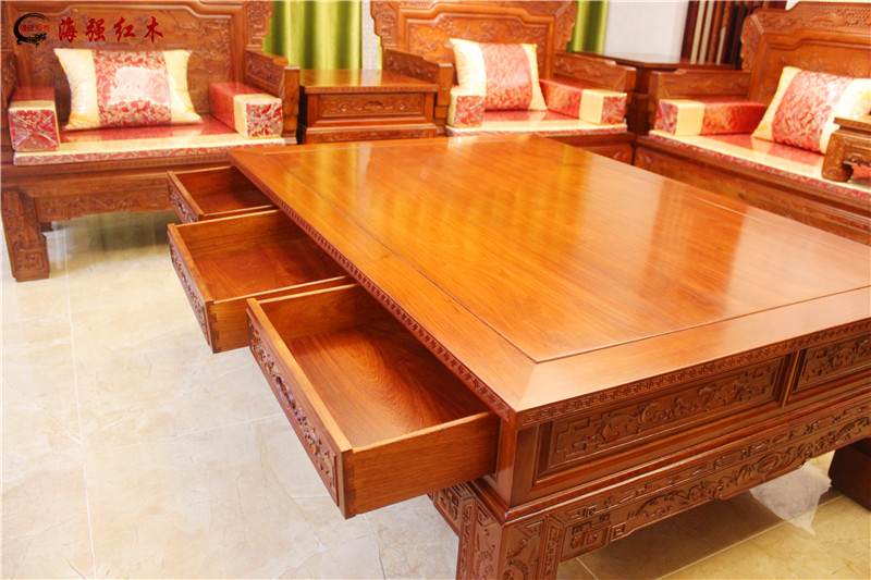汉宫沙发的大茶几,有6个抽屉都是能够打开的。